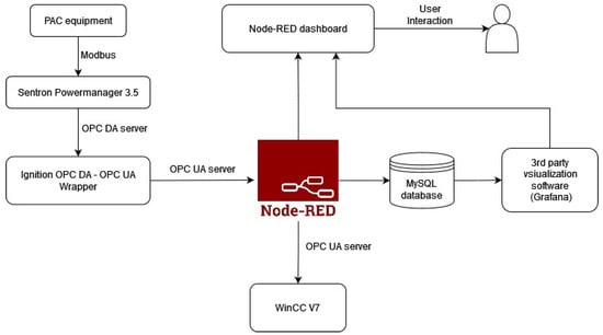 The legacy systems for the proposed integration consist of electrical parameter measurement equipment (PAC), which sends data to a SENTRON Power Manager 3.5 (PM3.5) using Modbus, and a system based on SCADA WinCC V7. The main concern of the integration is represented by the acquisition and centralization of data from each different equipment in the network while taking into consideration their specific constraints and requirements. Figure 2 presents the integration architecture, underlining the connection and different protocols used by the equipment. The main entities that define the network are the IIoT platform, reflected by Node-RED, the inputs and data sources represented by the PAC equipment and PM3.5, which are connected via Modbus, as well as the WinCC system and, finally, the database and visualization software that act as outputs. One of the main limitations observed by the authors was the communication constraints imposed by PM3.5, which only offered the Open Platform Communication Data Access (OPC DA) protocol. The solution was constructing a flexible and upgradable wrapper that would allow the OPC DA–UA conversion. The authors designed the wrap based on an Ignition gateway to have robustness, flexibility, and low cost. The wrapper can connect to any OPC DA server and provides its own OPC UA server to which the main Node-RED platform and other clients can connect.