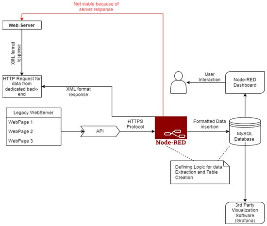 Each technology is part of the bigger picture pertaining to a complex system for integrating a complete solution that solves certain issues, which are observable in the legacy applications. These issues refer to the mechanism of data extraction, the API call, the response type, and the method utilized for point-to-point integration for high volumes of heterogeneous data. The stepping stone of the implementation is portrayed in Figure 6 by the process of the integration itself. As observable in the visualization, Node-RED hosts a series of particular processing units for data acquisition.