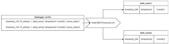 Furthermore, the query for database insertion was developed to undermine a dynamic implementation based on the incoming data lines. During this step, a function to include the addition of the timestamp in the correct format, with the transitional conversion of time in a 24-hour format, was added. The importance of the approach itself is worth mentioning here: database access constitutes a very time and resource-consuming operation; in this particular outline, the accent is on the performance boost, efficiency, and resource management, so there is exclusively one database access that includes the aforementioned number of 12 lines for INSERT operations. Moreover, the INSERT statement is constructed dynamically to be able to easily integrate disparate tables and extend the functionality of the module for newly added sensors and actuators. The structure of the established insertion statement is delineated, emphasizing the overall construction for the two specific values regarded in this implementation: temperature and humidity. The processing logic is expressed in Figure 7: