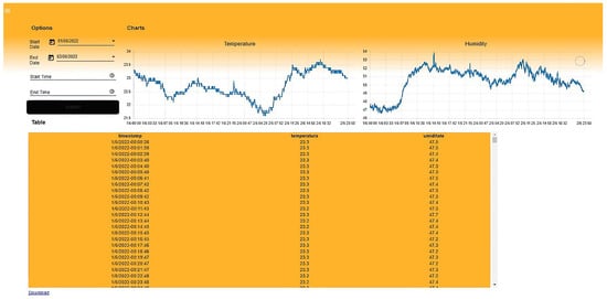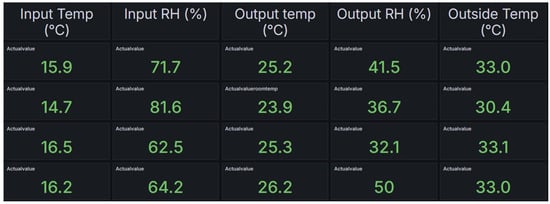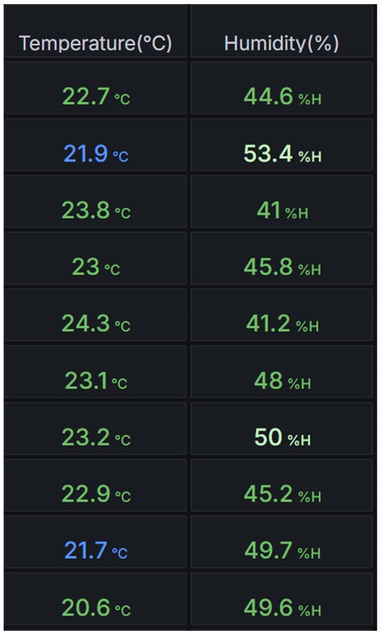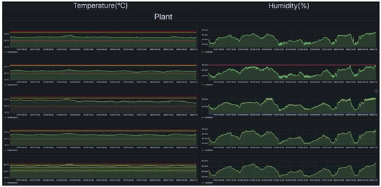 Figure 8 and Figure 9 illustrate Grafana dashboards that underline the favorable outcome of the processing logic. The graphics represent data acquisition results for sensors of legacy hardware equipment that register the values for temperature and humidity in the real industrial BMS medium, thus confirming that processing logic is viable and visualization for diverse data points is possible, attesting to the integrity and accuracy of data readings.