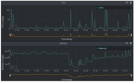 A further important aspect of this particular integration scenario is constituted by the performance of the approached processing and system architecture. As legacy systems are the foundation for industrial processes, it is vital to obtain a balanced outcome regarding performance. This case particularly refers to the handling of requests and subscriptions, their order, processing time, and efficient insertion. The obtained outcome for the resource consumption during a pre-established period of time was graphically designed under a line chart format, to be able to identify process execution and analyze patterns utilizing a trend. For each image, the X axis is represented by the timestamp, while the Y axis constitutes the CPU/memory usage depending on the illustration. An important aspect to note is the fact that spikes denoted in the constructed trend are the functional moments of the execution of processes and operations. Figure 13 depicts how these mechanisms are translated functionally.