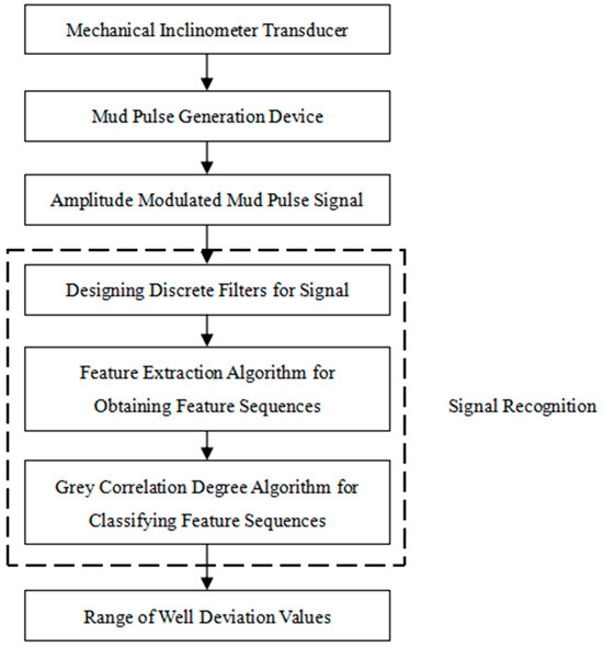 In summary, the positive pulse signals used in conventional mechanical measurements have lower transmission efficiency compared to amplitude-modulated signals. Therefore, studying how to recognize and demodulate the amplitude-modulated signals generated by mechanical measuring instruments is of significant importance. To address these issues, this paper proposes a method for recognizing and demodulating amplitude-modulated signals based on the amplitude-modulated signals generated by purely mechanical measuring instruments. According to the signal modulation method and its corresponding encoding structure, this approach includes three main analysis methods: signal filtering processing, extraction of relevant features, and classification of signal feature sequences using the grey relational analysis algorithm. The goal is to provide theoretical guidance for the transmission of mud pulse signals in ultra-deep wells up to 10,000 m deep. The developed process for identifying amplitude-modulated mud pulse signals is illustrated in Figure 2.