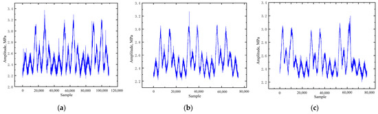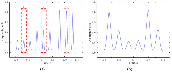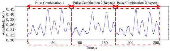 After the mud pulse signal is denoised, the encoding features within the signal become significantly more prominent, which in turn makes the signal easier to decode. An analysis of the encoding format of a single downhole signal collection reveals that, to ensure stable signal generation, the signal is repeatedly output, and the results of multiple repeated outputs are treated as a single signal segment to be decoded. As depicted in Figure 7, each signal segment for decoding consists of three identical pulse combinations, with the latter two pulse combinations being continuous repetitions of the first pulse combination.