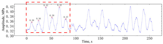 In each signal segment, all peak values are extracted to form a numerical sequence, which serves as the recognition feature of the pulse signal. Because of the repetitive nature of signal data, the first six values of the peak value sequence are employed as the identification interval during signal decoding. The peak value sequence within this interval is extracted as the feature sequence, as illustrated in Figure 8.