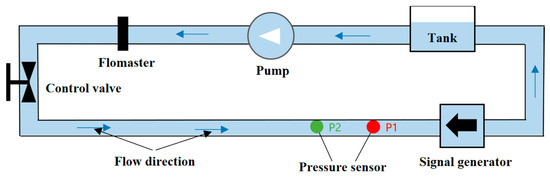 Subsequently, we constructed the platform illustrated in Figure 12 to conduct indoor experiments, further validating the applicability and recognition accuracy of the designed algorithm. The experimental setup included a tank, pump, Flomaster, and control valve, with careful consideration given to the impact of mud pump noise on pulse signals. To ensure comprehensive data collection, the experimental system includes two pressure sensors. Pressure sensor P1, positioned near the pulse generator was utilized to capture mud pulse signals, while pressure sensor P2 served as a backup. The inclination was set from 5° to 55°, conducting experiments at intervals of 10°. Filtering was applied to the pulse signals collected by the pressure sensor. Figure 13 illustrates the raw and filtered signals at inclinations of 5°, with schematic diagrams of signals at other inclinations provided in Appendix A.