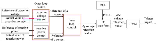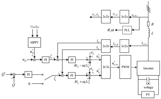 From Equation (7), the simplified control block diagram is shown in Figure 3, including double-loop control with outer and inner loops in the dq axis. The specific control equations are shown in Figure 4. In the figure, UPV and IPV are the output voltage and current of the PV array, respectively, and the DC voltage reference value is obtained after the Maximum Power Point Tracking (MPPT) module; the reference value of the current component (active current component) is obtained after the difference between the DC voltage reference value and the feedback value udc through the proportional-integral (PI) regulator. Because the inverter generally operates in the unit power factor state, the reference value of the q-axis current (reactive current component) = 0. Then, and are compared with the feedback value of id, iq after the difference through the PI regulator. One must take into account the corresponding coupling terms −Rid + ωLiq, −Riq − ωLid and the perturbation term ed, eq, then the inverter reference voltage , can be obtained. Then, the 2r/3s transformation , , can be obtained under the three-phase coordinate system of the voltage modulation wave, which is compared with the high-frequency triangular wave carrier to generate Pulse Width Modulation (PWM) signals, so as to control the switching of inverter tubes on and off.