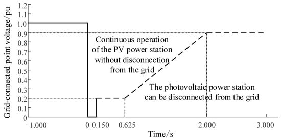 When the PV power supply is connected to the 10 kV-and-above bus and the grid transient faults are caused by voltage fluctuations at the grid point, an improper PV power supply transient control strategy will exacerbate the transient fluctuations of the grid, and therefore, it is required that it must have a certain grid support capacity. The requirements for the LVRT (Low-Voltage Ride Through) capability of PV power plants are shown in Figure 5 [13]. The PV power supply is required to provide a certain amount of reactive power support after a fault, and the corresponding current should be satisfied as (8) and (9). In Figure 5, p.u. (per unit) represents the relative value of parameters.