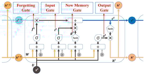 The basic principle of LSTM is shown in Figure 6 [21,22,23,24,25,26], which shows that the output of LSTM at the moment of t not only needs to refer to the output of the hidden layer at the moment of t − 1 but also the cell state of the cell state at the moment of t − 1. At the same time, the forgetting gate, input gate, new memory gate, and output gate are introduced in LSTM to control the long-term cell state.