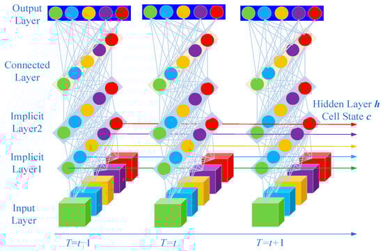 The LSTM model is used to establish the mapping relationship from the output coefficient of the distributed generation system to the aggregated external characteristic curve. The neural network training model based on the LSTM model is shown in Figure 7 [27,28,29]. The LSTM model mainly consists of an input layer, an implicit layer, a fully connected layer, and an output layer. Firstly, a one-dimensional convolutional layer is used to extract features from the PV output data of the input model and is activated by the Tanh function. Then, two LSTM implicit layers are built to process the output of the convolutional layer, and finally, the output of the LSTM is mapped to a sequence of external characteristic curves using a fully connected layer and activated using Sigmoid as the output. In Figure 7, the implicit layer module is expanded in detail as the LSTM schematic of Figure 6, in which the output of the implicit layer and the state of the unit are passed along the time chain, the output of implicit layer 1 is used as the input of implicit layer 2 , and the output of implicit layer 2 is used as the data input of the fully connected layer.