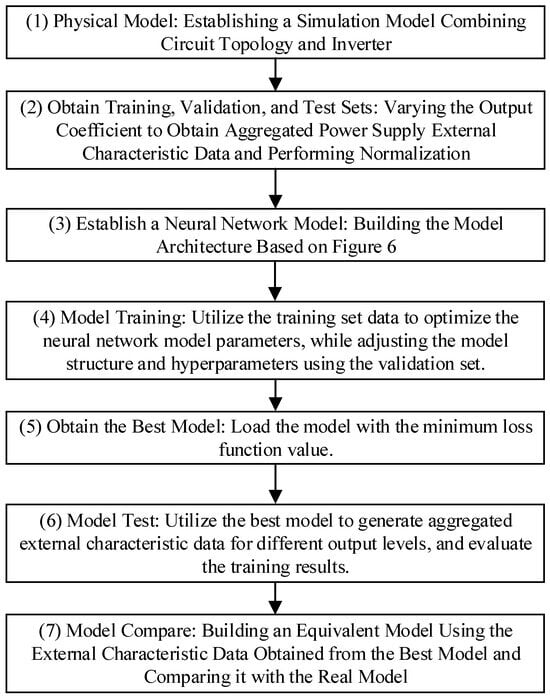 Based on the above theoretical analysis, the process of distributed power supply fault output aggregation modeling is described in detail, and its specific modeling, training, and evaluation process is shown in Figure 8. In Figure 8, steps (1) and (2) are based on the theory in Section 1, and the corresponding physical model is built on the simulation software and simulated several times to obtain the input and output data required for neural network training; step (3) is based on Figure 7 to build the corresponding LSTM neural network; steps (4), (5), and (6) represent the three processes of neural network training, i.e., training the model, obtaining the optimal model, and testing the model; and step (7) is to test the reliability of the training model by using the real physical model to test the reliability of the training model.