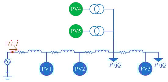 The LSTM neural network is utilized to equate its equivalent output characteristics, and the test set data are used to check the training results and compare them with the real physical model to verify the effectiveness of the proposed algorithm. The network topology of the PV distribution network is shown in Figure 9. Consider five distributed power sources, three of which have LVRT capability—PV1, PV2, and PV3—with capacities of 2 MW, 4 MW, and 6 MW, respectively, corresponding to the blue PVs in Figure 9. PV1 and PV2 go off-grid when their terminal voltages are lower than 0.2 pu, and PV3 maintains grid connectivity when its terminal voltage is lower than 0.2 pu. PV4 and PV5 are rooftop PVs with no LV ride-through capability, with capacities of 30 kW and 50 kW, respectively, corresponding to the green PVs in Figure 9. The total line impedance is 1.92 + j2.073 Ω, corresponding to a line length of about 6 km. The load of the line is dispersed at two nodes, with a total load of 5 MW and a power factor of 0.95.
