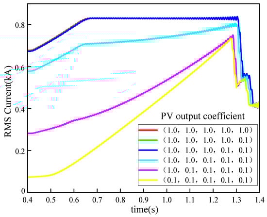 From Figure 10, it can be seen that when the voltage at the grid connection point starts to drop, the effective value of the current at the grid connection point of the distribution network with different outputs all increase. The smaller the output coefficient, the more obvious the increase in effective value. When the voltage further drops and approaches 0, due to the characteristics of the inverter itself and the LVRT requirements, the effective value of the current rapidly decreases, and the decreasing trend of different output distribution networks is similar.