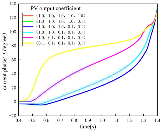 From Figure 11, it can be seen that after the voltage at the grid connection point starts to drop, the phase of the current at the grid connection point of the distribution network with different outputs also increases. The larger the output coefficient, the more rapidly the phase increases. When the voltage further drops and approaches 0, the phase of the current rapidly changes, and the decreasing trend of different output distribution networks is similar.