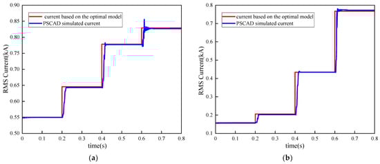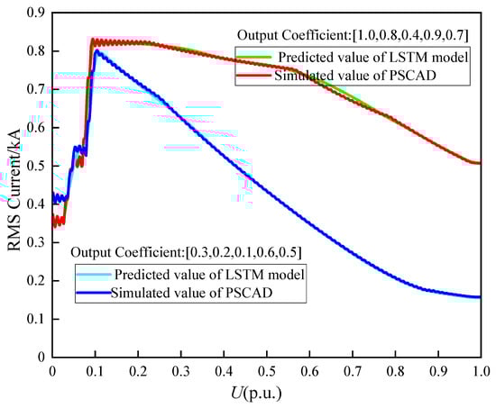The PV output coefficients of [1.0, 0.8, 0.4, 0.9, 0.7] and [0.3, 0.2, 0.1, 0.6, 0.5] are selected to compare the line current waveforms with the simulation results of the full PSCAD model, respectively. Figure 15 demonstrates the waveform comparison between the LSTM model-based power system and the simulation model current RMS for the two output cases.