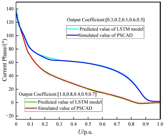 The training and validation sets are used to train and optimize the weights of each layer of the LSTM neural network to obtain the model with the minimum loss function, i.e., the optimal model. Two different combinations of output power are randomly selected in the test set, and the optimal model is used to predict the RMS values and phases of the output currents, which are compared with the PSCAD simulation results, and the corresponding comparison curves are shown in Figure 12 and Figure 13.