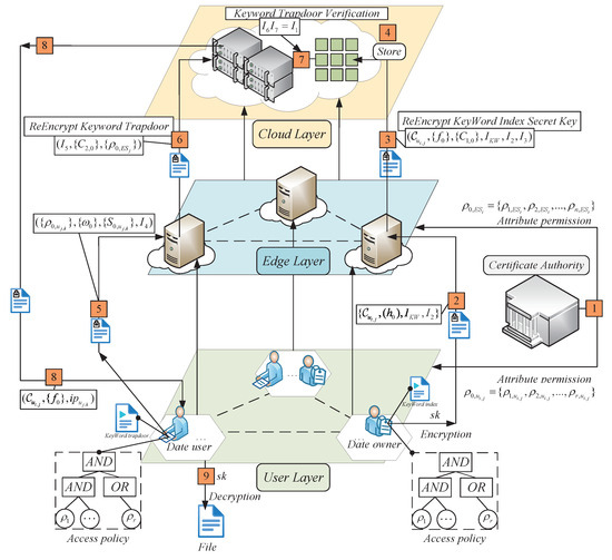 User layer: This layer consists of mobile data users and data owners. The data owner is the one who uploads the shared resources. For a data user to access the decrypted key factor and ciphertext resources, their attribute permission set must match the access policy. Additionally, only when the keyword index and trapdoor are successfully verified by the cloud server will ciphertext resources be accessible.