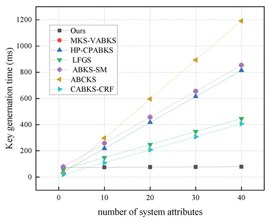 Computational costs in KeyGen. (The red line of MKS-VABKS overlaps with the purple line of ABKS-SM).