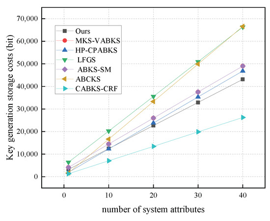 Storage costs in KeyGen. (The red line of MKS-VABKS overlaps with the purple line of ABKS-SM).