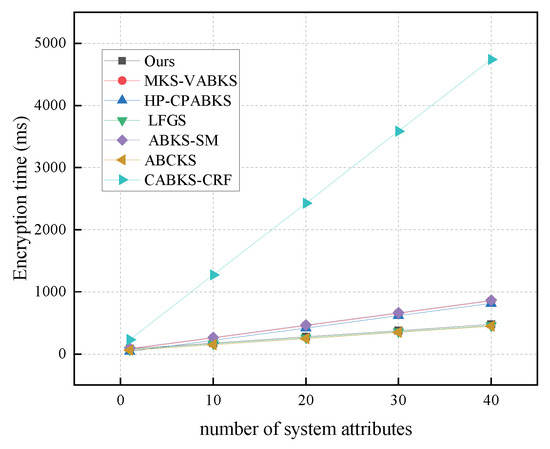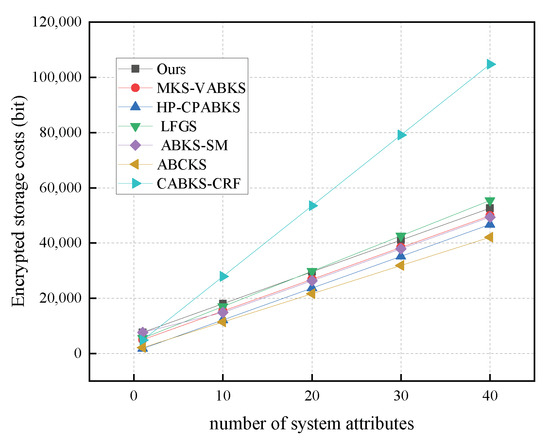 Key generation: Data users in our scheme need to obtain public and private key pairs and attribute permissions, and our scheme has a very significant reduction in computational overhead compared to the schemes in [31,32,38,39,40,41]. The data user obtains the corresponding attribute privileges by CA authentication computation for randomly selected attributes from the attribute collection, and our scheme significantly outperforms the compared schemes. Our scheme has slightly higher storage overhead compared to the scheme in [41], but it is superior to the schemes in [31,32,38,39,40]. It offers certain advantages in terms of storage overhead and shows significant advantages for data users with limited resources.