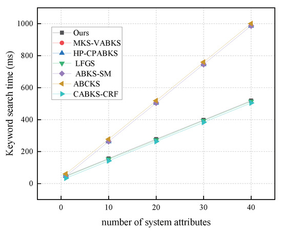 Computational costs in Keyword Search. (The red line of MKS-VABKS and the blue line of HP-CPABKS overlap with the purple line of ABKS-SM.)