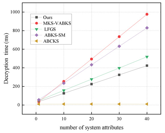 In Figure 13, we analyze the computational overhead of the decryption algorithms. The scheme in [31] exhibits a computational overhead of 830.66 ms, while the schemes in [32,38] show time overheads of 976.67 ms and 518.48 ms, respectively. Our scheme achieves a time overhead of 423.55 ms, and although the scheme in [40] has a time overhead of 9.93 ms, our scheme still significantly outperforms it in overall computational cost. In Figure 14, we analyze the storage overhead of decryption algorithms with the number of system attributes set to 40. Both our scheme and the comparison scheme in [32] have the same storage overhead of 0.125 kb. In contrast, the schemes in [31,38] have storage overheads of 2.64 kb and 2.56 kb, respectively. Our scheme demonstrates a clear storage advantage in this phase, making it suitable for resource-constrained terminal devices.
