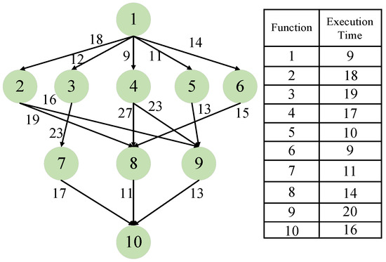 In serverless computing, a complicated application is provided based on the orchestration of a set of functions, which can be seen as a serverless workflow. In general, a serverless workflow can be modeled as a Directed Acyclic Graph (DAG) , where V is the set of functions represented by vertices, and E is the set of precedent dependencies represented by edges [35]. We use to represent the i-th function in the workflow and assume that there are K functions making up the workflow; thus, V can be expressed as . We use to represent the data dependency from function to function , which indicates that the outputs of function are inputs to function . When executing a serverless workflow, limited resources will first be supplied based on capacity planning [36,37]. For example, the maximum number of containers is set in the main commercial serverless platforms, such as Amazon AWS Lambda, Google Cloud Functions and Microsoft Azure Functions [38]. Then, available running environments will be allocated to functions in the serverless workflow, which is called function scheduling.
