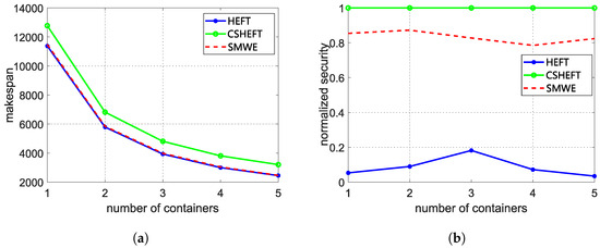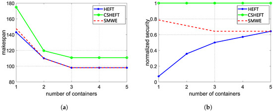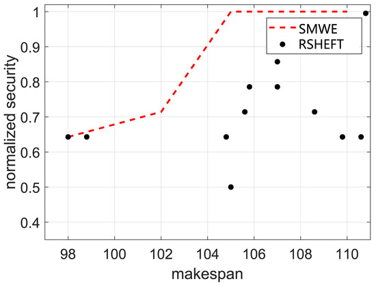 Then, we compare our framework with RSHEFT. The number of available containers is set as 3, and the different weight (ranging from 0 to 1) of security performance is set to obtain different scheduling results. The RSHEFT is repeated for 1000 times to obtain different results, which is depicted in Figure 7. It can be inferred that our framework has a better security performance than that of RSHEFT with the same makespan, which demonstrates the effectiveness of our framework. In the practical scenario, we can adjust the weight of the security performance to meet the makespan constraint and optimize the security performance using our framework.
