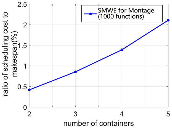 Generally, some real-world workflows have a larger number of functions, such as some scientific workflows (e.g., Epigenomics, Inspiral, CyberShake and Montage) [45,46]. Accordingly, we conduct a set of simulations to evaluate the scalability of our algorithm. In our simulation, Montage workflows with 1000 functions are applied to evaluate the time cost for generating the scheduling solution. The ratio of scheduling cost to makespan is selected as the scalable property of our framework, which is shown in Figure 8. It can be inferred that the ratio of scheduling cost to makespan is less than for Montage with 1000 functions. Thus, the cost of scheduling delay can be seen as negligible. Based on these results, we can determine that our framework can support the workflow scheduling with thousands of functions.