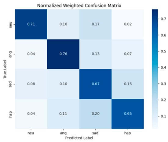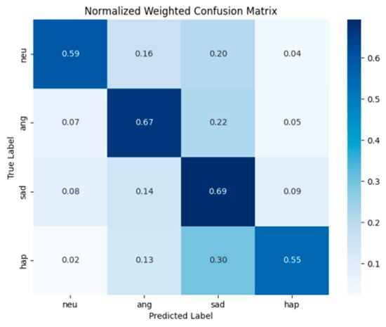 WA and UA with different proportions of cross-entropy loss and focus loss are shown in Table 4. It can be seen from the table that the IEMOCAP dataset had the best effect when the ratio of cross-entropy loss and focus loss was 0.8:0.2. Cross-entropy loss is often used for multiple classification tasks and can effectively punish classification errors, prompting the model to predict the main class more accurately. Focus loss focuses on reducing the weight of easy-to-classify samples while increasing the impact of hard-to-classify samples, which is particularly helpful for learning rate categories in unbalanced datasets. In an uneven sample dataset such as IEMOCAP, some emotion classes may have fewer samples, which leads to the possibility that the model may prefer to learn the common classes while ignoring the rare ones during training. Setting the ratio of cross-entropy loss and focus loss to 0.8:0.2 makes the model pay more attention to the rare classes during training, thus improving the classification performance for a few classes. Cross-entropy loss ensures optimization in overall classification accuracy, while focus loss makes the model perform better in difficult classification situations, and the combination of the two can balance the performance of the model across various categories.