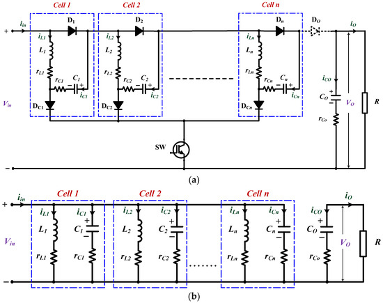 - The converter works in the CCM, considering the design considerations of inductors and capacitors as follows:where Ln is the inductance of cell n, Cn is the capacitance of cell n, Co is the output capacitance, R is the load resistance, ∆i is the allowable percentage of the inductor current ripple, and ∆v is the allowable percentage of the capacitor voltage ripple.