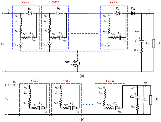 Figure 2 illustrates the on-state equivalent circuit of the proposed multicell converter. The active and inactive semiconductor devices are shown in Figure 2a, while the analogous circuit diagram of the converter is displayed in Figure 2b. In the on state, the semiconductor switch and all diodes except the output diode (Do) are closed.