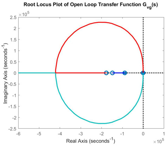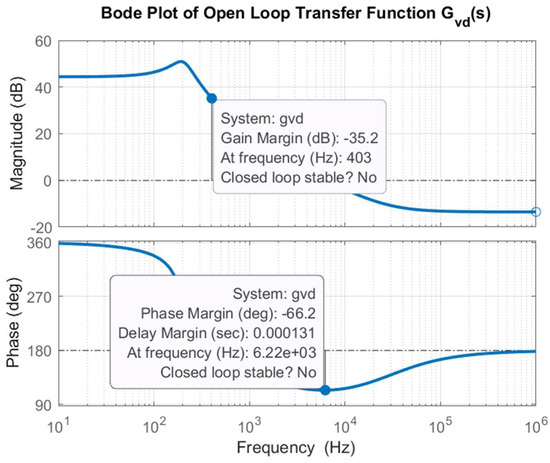 As important measures of the converter stability, Figure 4 illustrates the bode plot diagram of the open-loop control-to-output transfer function Gvd(s) of the suggested two-cell boost converter, while the root locus diagram is shown in Figure 5. It is found that the gain margin Gm = −35.2 dB at phase crossover frequency Fcp = 403 Hz and phase margin Pm = −66.2° at gain crossover frequency Fcg = 6220 Hz, which refers to the instability. Also, as shown in Figure 5, there is a zero on the right half side of the s-plane.