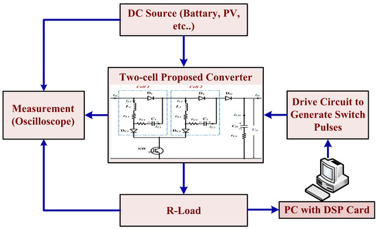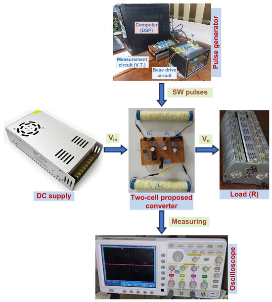 Figure 8 shows a photo of the actual experimental setup of the proposed single-switch two-cell boost DC-DC converter. It consists of a DC power supply (24 V, 20 A), a single-switch two-cell proposed boost DC-DC converter, a resistive load, a function generator (AFG-3051, 50 MHz, GW Instek, Taipei, Taiwan), a digital storage oscilloscope (TDS8204, 200 MHz, 2 GSa/s, Owon, Zhangzhou, China), a digital signal processor (DS1104, dSPACE, Paderborn, Germany), a voltage transducer (LV 25-p, LEM, Meyrin, Switzerland), and a drive circuit. The proposed converter is supplied from a DC source 24 V to supply a resistive load of 130 Ω by controlling the power switch pulses that come from the function generator with a switching frequency of 5 KHz. The oscilloscope is used to capture the voltage and current waveforms. The proposed converter circuit is examined in both open-loop and closed-loop operations. The schematic diagram for the experimental setup system is shown in Figure 9. This system shows the system structure for open-loop and closed-loop operations.