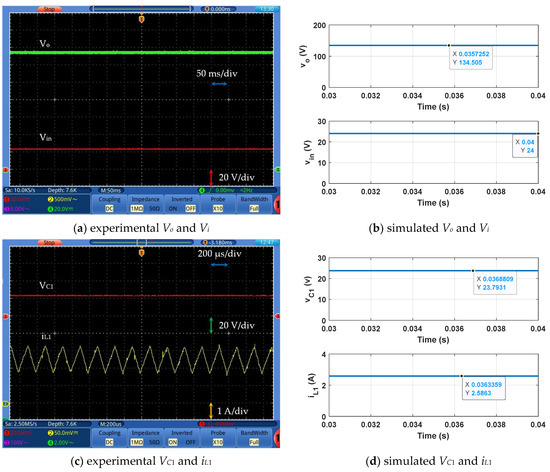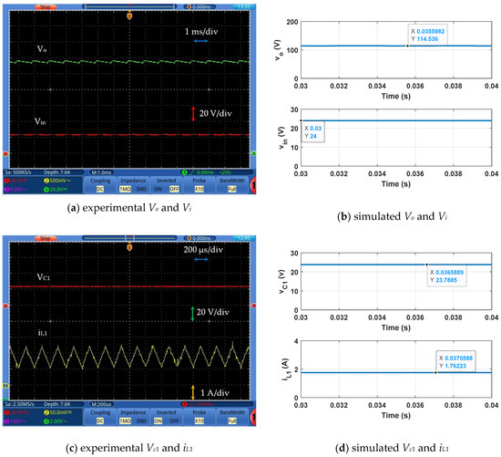 The proposed single-switch two-cell boost DC-DC converter is first examined in the open-loop operation. Figure 10 and Figure 11 show the comparison between the experimental and simulated SSAM open-loop performance of the proposed single-switch two-cell boost DC-DC converter at duty cycles D = 0.5 and D = 0.6, respectively. The simulation results are obtained using Matlab R2023b software. The steady-state average values of the variables (Vo, VC1, iL1, VC2, and iL2) of the SSAM of the suggested topology are compared to the corresponding experimental switching waveforms captured from the actual laboratory setup at steady state at the same input voltage Vin = 24 V. As shown in Figure 10, the SSAM simulation gives a theoretical average output voltage (Vo) of 114.54 V, while the output voltage of the experimental converter oscillates between 113 V and 117 V due to switching (experimental average of (113 + 117)/2 = 115 V). Therefore, the theoretical average (114.54 V) and the experimental average (115 V) of the output voltage are very close, which proves the SSAM validation. Also, the inductor currents (iL1 and iL2) are similar in experimental and simulation tests. The steady-state value of the simulated inductor current-based SSAM of the converter has a value of 1.76 A, while the steady-state experimental inductor current (iL1 or iL2) oscillates between 1.1 A and 2.6 A (experimental average of (1.1 + 2.6)/2 = 1.85 A). Moreover, the capacitors’ voltages (vC1 and vC2) are similar in experimental and simulation tests.