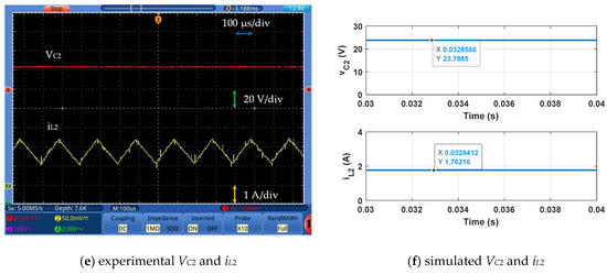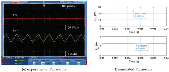 Open-loop performance of the proposed multicell converter (n = 2) when the input voltage Vin = 24 V, D = 0.5, and Fs = 5 kHz: (a,c,e) experimental and (b,d,f) simulation results based on the SSAM.