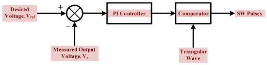 The experimental prototype of the proposed multicell converter (n = 2) is also examined during a closed-loop control. Converter stability and dynamic performance need to be improved by designing the PI controller. Consequently, the phase and gain margins by designing a robust feedback (closed-loop) controller are properly selected. A schematic diagram of the circuit that is utilized to control the output voltage of the proposed converter is shown in Figure 12.