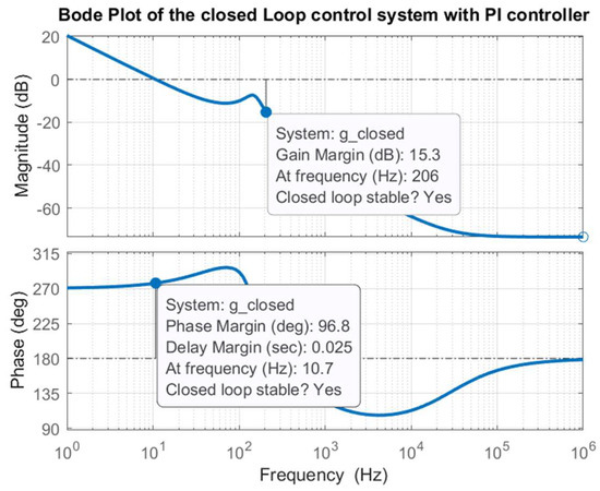 where KP and KI are the parameters of the PI controller. To obtain a stable and well-regulated DC-DC converter, the phase margin of the controlled converter should be greater than 45° [41]. A higher phase margin enhances the transient performance of the converter. A PI controller is designed to regulate the output voltage of the multi-cell DC-DC boost converter against load, input voltage, and reference voltage variations. The PI controller parameters are selected based on the stability analysis using the frequency response technique. The proportional (KP) and integral (KI) gains of the PI controller are selected to be KP = 0.001 and KI = 0.4 based on the required phase margin of 96.8° and gain margin of 15.3 dB. Figure 13 displays a bode plot of the closed-loop system with the designed PI controller. It is clear from the figure that the designed closed-loop control system is stable.