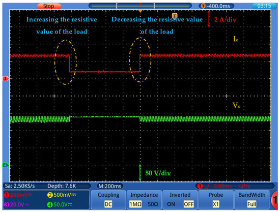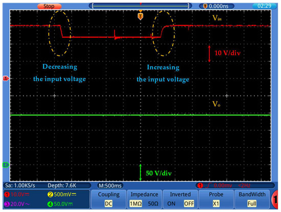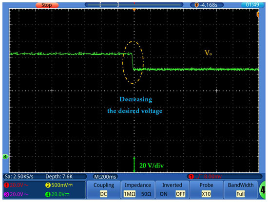 The experimental responses of the proposed multicell converter (n = 2) during closed-loop control are captured. Figure 14 shows the output voltage response starting with changing the reference voltage (Vref) to 150 V at Vin = 24 V. It is observed that the output voltage signal has a good dynamic response and tracks the reference voltage smoothly without overshoots and undershoots. To examine the robustness of the closed-loop control of the proposed multicell converter (n = 2), Figure 15 demonstrates the output voltage and current responses by changing the resistive value of the load at Vref = 140 V. Figure 16 presents the output voltage response at Vref= 145 V by changing the input voltage (Vin) from 31 V → 24 V → 31 V. As obvious, the output voltage signal has a good dynamic response. Also, Figure 17 shows the output voltage response at Vin = 24 V by changing the reference voltage (Vref) from 125 V → 115 V. The output voltage response tracks the reference voltage smoothly.