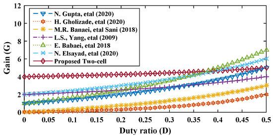To provide deeper insight into, and analysis of, the proposed converter and previous converter works, Figure 18, Figure 19, Figure 20, Figure 21, Figure 22, Figure 23, Figure 24 and Figure 25 show plots based on the data in Table 2. In Figure 18, the voltage gain (G) under duty ratio changes (D) for the proposed converter and the prior converter topologies are plotted. As obvious, the proposed converter boasts a higher voltage gain compared to previous boosting converters for D ≤ 0.4. Additionally, the proposed converter demonstrates superior voltage gain even at very low duty cycles. This indicates that the suggested boost converter experiences lower switching and conduction losses, resulting in higher efficiency.
