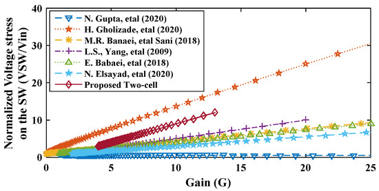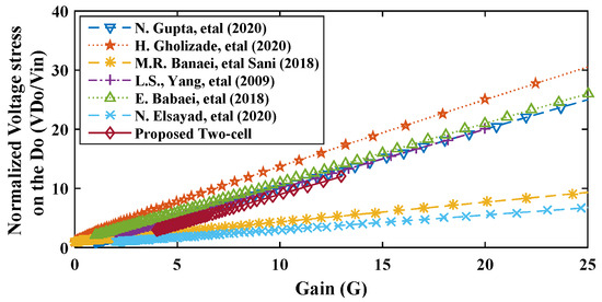 Figure 19 shows the normalized voltage stress on the SW () versus the voltage gain. It is observed that the SW in the proposed converter experiences good voltage stress at high voltage gain compared to the power switches in previous converters. It can be seen that the previous converter topologies with low voltage stress have a large number of components, as in [25,27,29,30]. Additionally, the proposed converter topology has a reasonable voltage stress compared to the converters in [26,28], which have nearly the same number of components. In Figure 20, the voltage stress on the diode in the proposed converter has a moderate value compared to the diodes in the previous converters. This comparison proves the improved performance of the proposed converter and stress reduction.