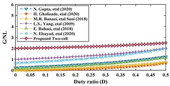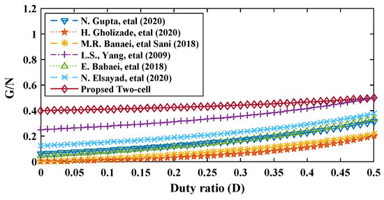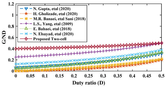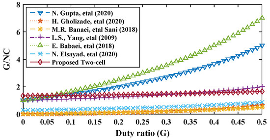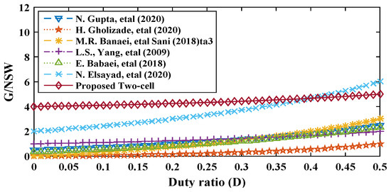 In Figure 21, Figure 22, Figure 23, Figure 24 and Figure 25, the duty ratio is plotted versus gain to total component count ratio (G/N), gain to switch count ratio (G/NSW), gain to diode count ratio (G/ND), gain to diode count ratio (G/ND), gain to inductor count ratio (G/NL), and gain to capacitor count ratio (G/NC) for the proposed converter and the prior converter works. As is obvious, the proposed converter exhibits higher gain compared to previous converters concerning the number of components. The proposed converter shows a higher gain compared to previous converter works, particularly for D ≤ 0.5.