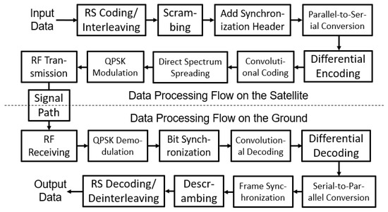 The complete data processing flow chart of low-orbit satellite signals on the satellite and on the ground is shown in Figure 1. The core steps of the processing flow on the satellite include two frequency conversions, that is, the encoded I and Q channel data process directly spread spectrum (spread spectrum code rate 10.23 MHz, code length 1023) and spectrum shifting (QPSK modulation) to the radio frequency band of 2~3 GHz for transmission. The processing flow of the receiving terminal on the ground is the reverse process of the processing flow on the satellite [1,3].