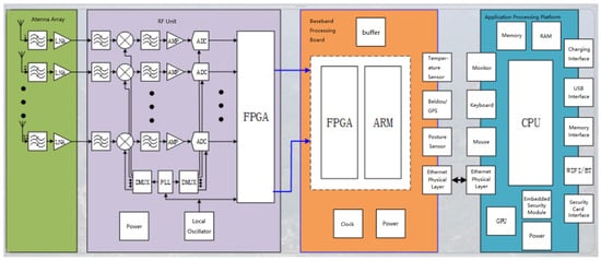 As introduced before, according to the independence of functions of each part in the low-orbit satellite signal on-board and ground data processing processes, the system can be divided into four parts: antenna array, radio frequency unit, baseband processing board, and application processing terminal.
