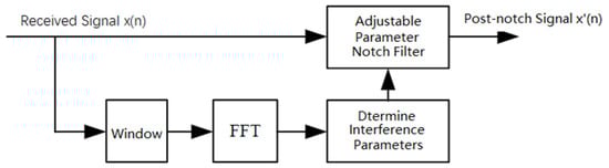 The principal block diagram of the time–frequency domain anti-narrowband interference technology is shown in Figure 5. The AD sampled data are divided into two channels, one channel is sent to the time domain notch filter for time domain notch processing, and the other channel is sent to the interference detecting module to accurately detect the frequency band location of the interference and then configures the notch parameters, thereby combining the advantages of the time domain and frequency domain to achieve the purpose of removing interference [22,32,34,35,36].