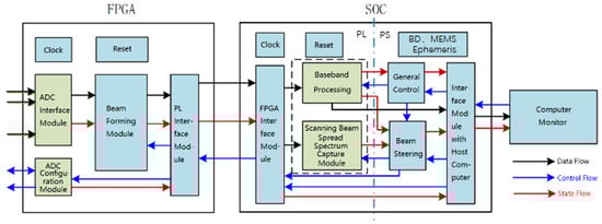 The SoC baseband board mainly implements digital beam synthesis, anti-interference processing, signal acquisition, tracking, and decoding, and uses a board-to-board high-speed connector to connect the baseband board and the multi-channel down-conversion board. The 32 channels of intermediate frequency signals are sent to the 32 channels of ADC for analog-to-digital conversion, and then the digital signals are sent to the beam steering FPGA. The beam steering FPGA uses Fudan Microelectronics’ JFM7K325T (K7 for short) chip which contains a large number of DSP units inside the chip. The DSP unit is mainly used for digital down-conversion and phase-shifting processes of multi-beams, narrow-band anti-interference, etc. [44]. The synthesized beams complete narrow-band anti-interference inside the FPGA. After processing, it is sent to the baseband processing FPGA. The chip contains a large number of logic resources, which is sufficient for multi-channel capture, tracking, and decoding processes. The schematic block diagram of the baseband processing board is shown in Figure 15.