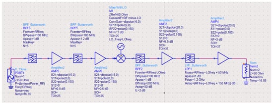 This scheme uses ADS 2020 software to design the gain of the RF circuit and estimate the noise figure, InP1dB, and IIP3 values. Considering that if the received signal is required to have an anti-interference signal-to-interference ratio of >45 dB, the power range of the satellite signal reaching the ground is −127~−115 dBm, that is, the receiver can resist interference of −70 dBm (−115 dBm + 45 dB). In this case, the receiver is required not to be saturated due to the interference signal. The saturated input power of a typical high-speed ADC is about 2 dBm; the receiver’s in-band (200 MHz) thermal noise is about −90 dBm, and the amplified thermal noise is required to be greater than the quantization noise of the ADC. Based on the above two points, it is reasonable to set the receiver’s amplification factor to 55 dB. According to the above analysis, the simulation of the RF link is shown in Figure 16.