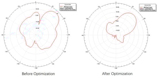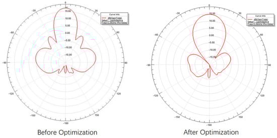 Figure 18 and Figure 19 show the beam characteristic diagrams of (θ, φ) = (0°, 0°) and (θ, φ) = (0°, 45°) before and after optimization, respectively. Due to space limitations, the beam characteristic diagrams of other angles before and after optimization are not listed here.