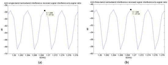 (a) Schematic diagram of the interference-to-signal ratio of the received signal in anti-single-band narrowband interference test; (b) schematic diagram of the interference-to-signal ratio of the received signal with frequency in three-band narrowband interference test.