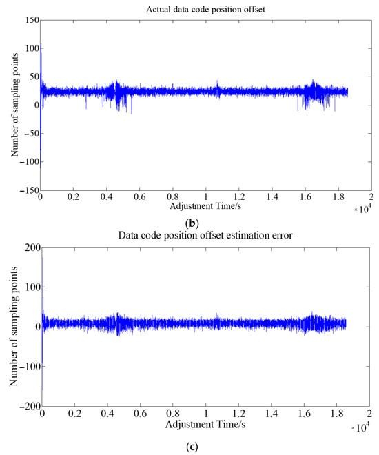 Bit synchronization ring operation results: (a) estimated data code position offset; (b) actual data code position offset; (c) data code position estimation error.