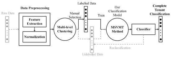 Using the proposed multi-level clustering method, we obtain partially labeled tenants that can be used to train our classification model. This section introduces a multi-level SVM classification model based on a decision tree (MSVMT) to complete the classification work.
